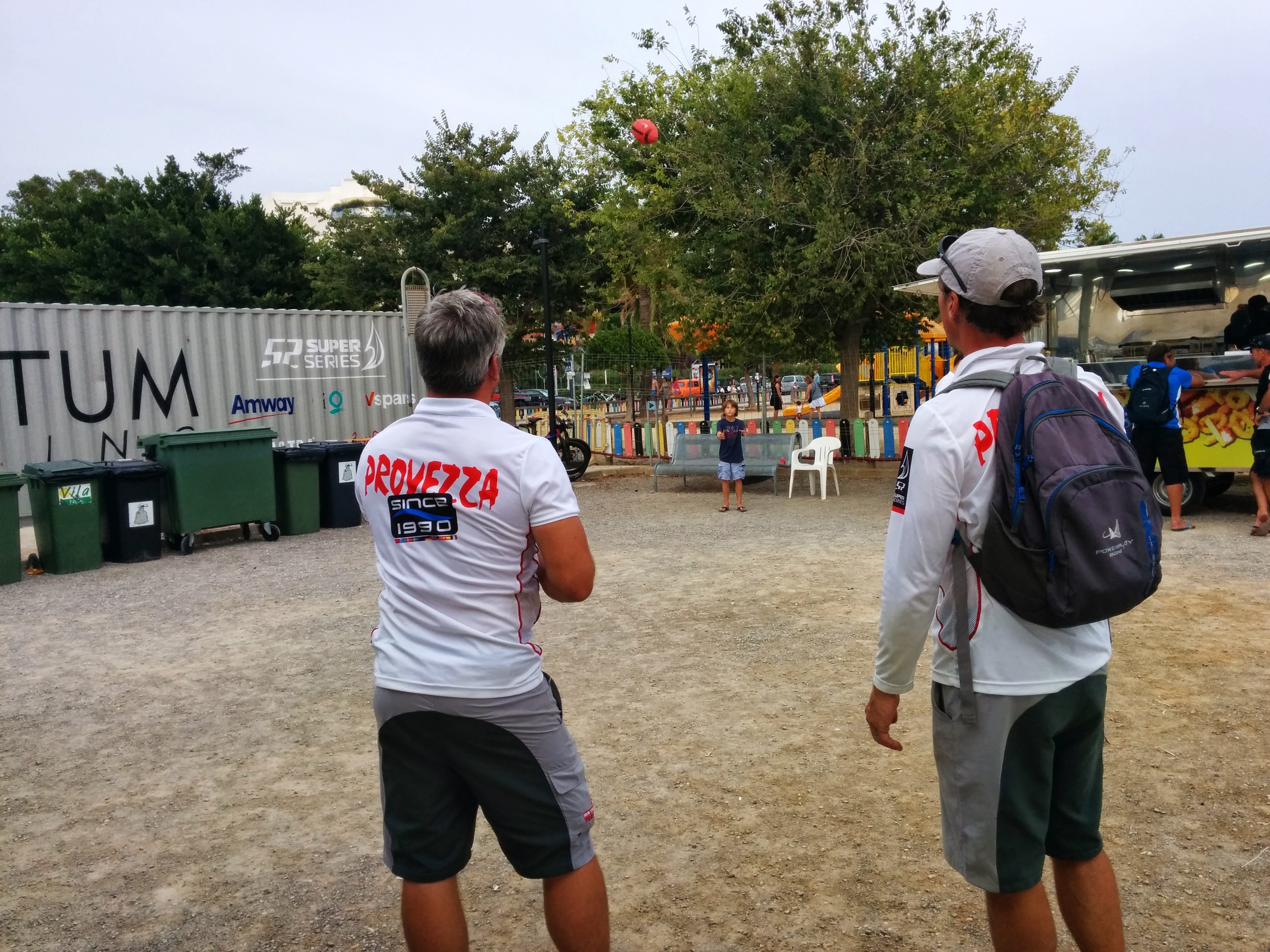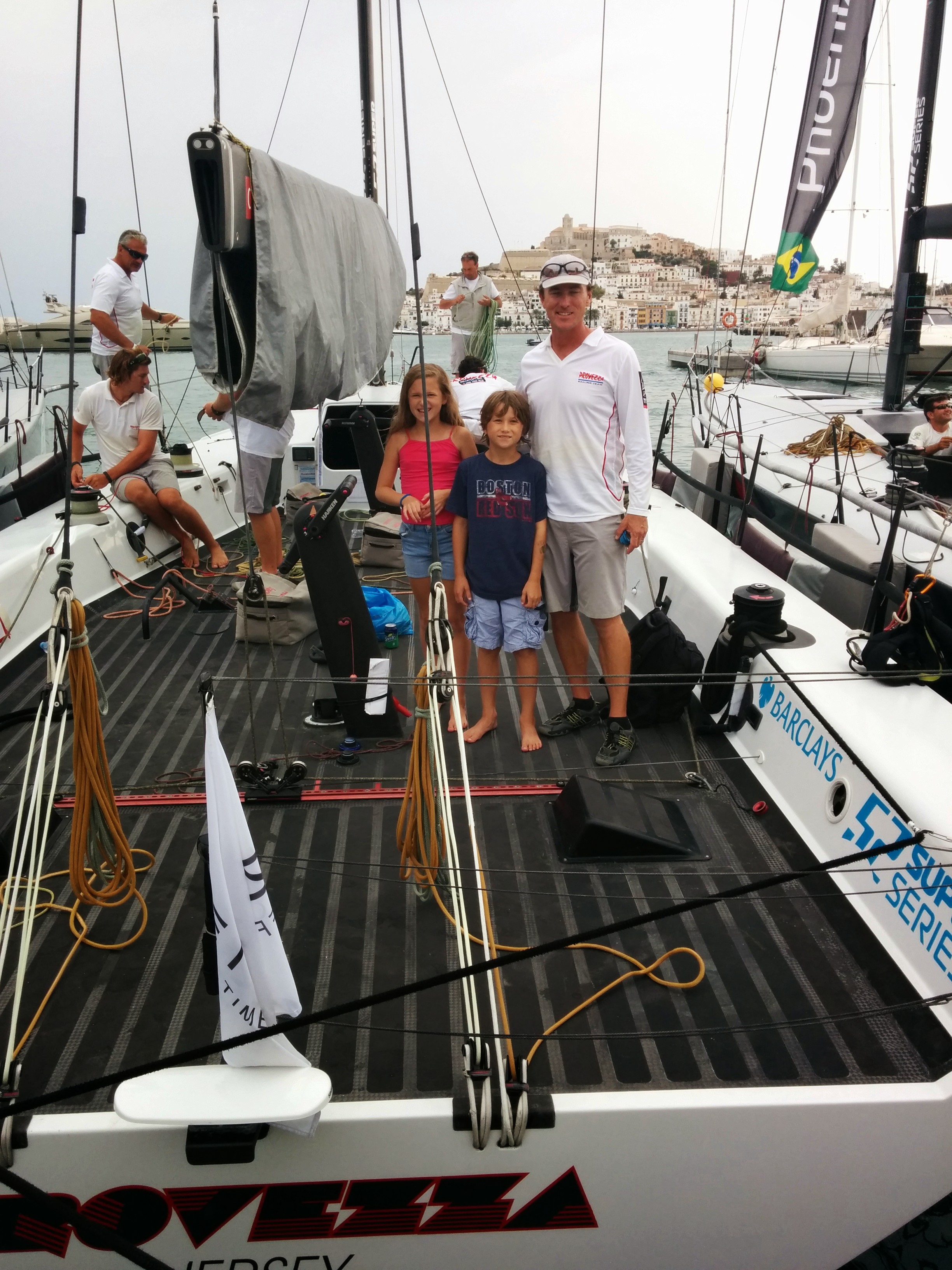 Waving in our Team: Provezza, TP52. The kids in the bottom photos are onboard PROVEZZA with dad after sailing. Dalt Vila (the old city) in the background. Oliver throwing football pass with teammates post-racing.