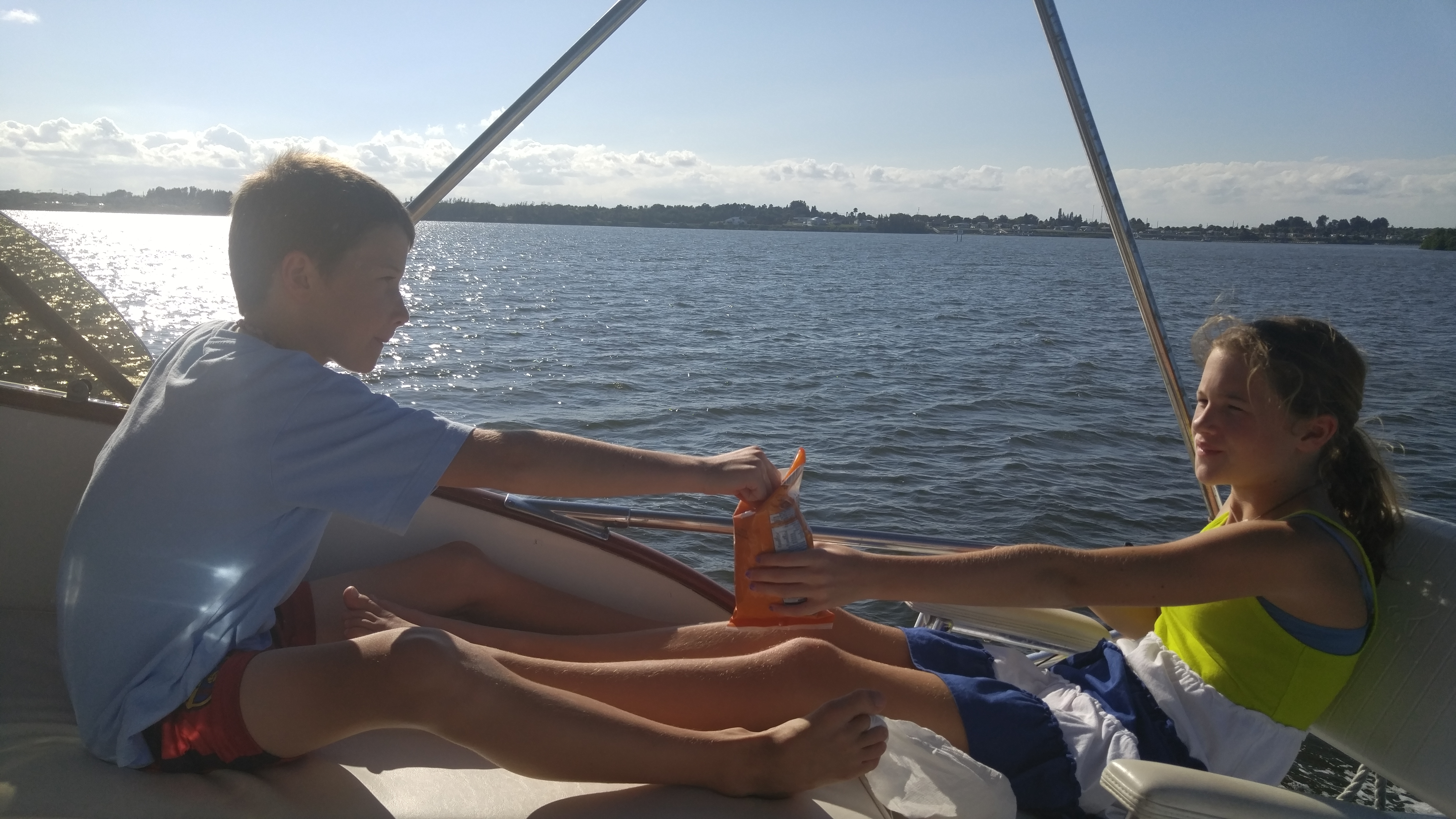 (Sharing a favorite snack of pipas – sunflower seeds – on the flybridge)