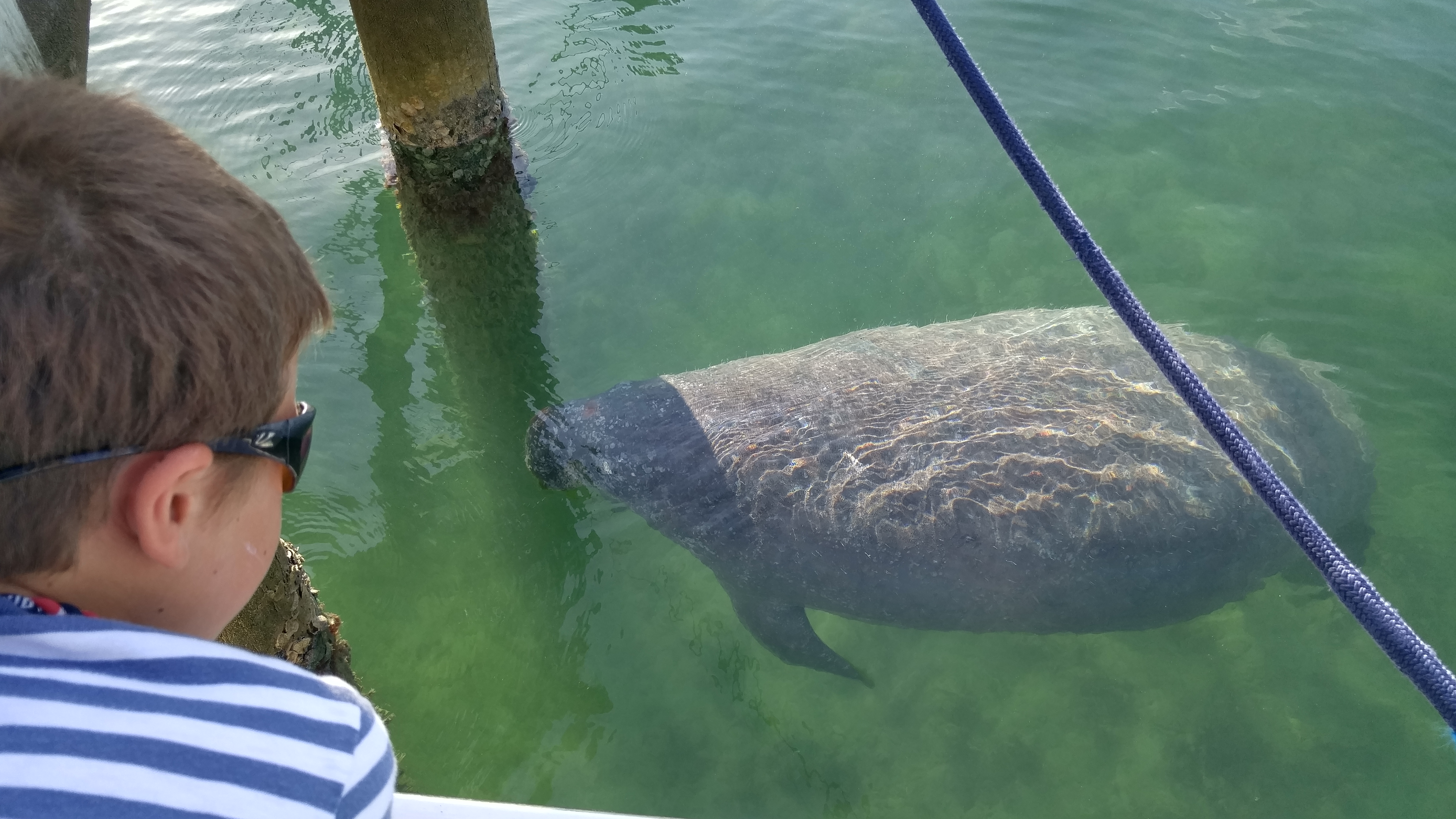 The manatee come by to visit, looking for fresh water and easy camaradie. This allows us to study them more closely. Though we often saw them in FL, the water is so completely clear here, that we can really get to know our large friends. This one’s name is “Randy”.