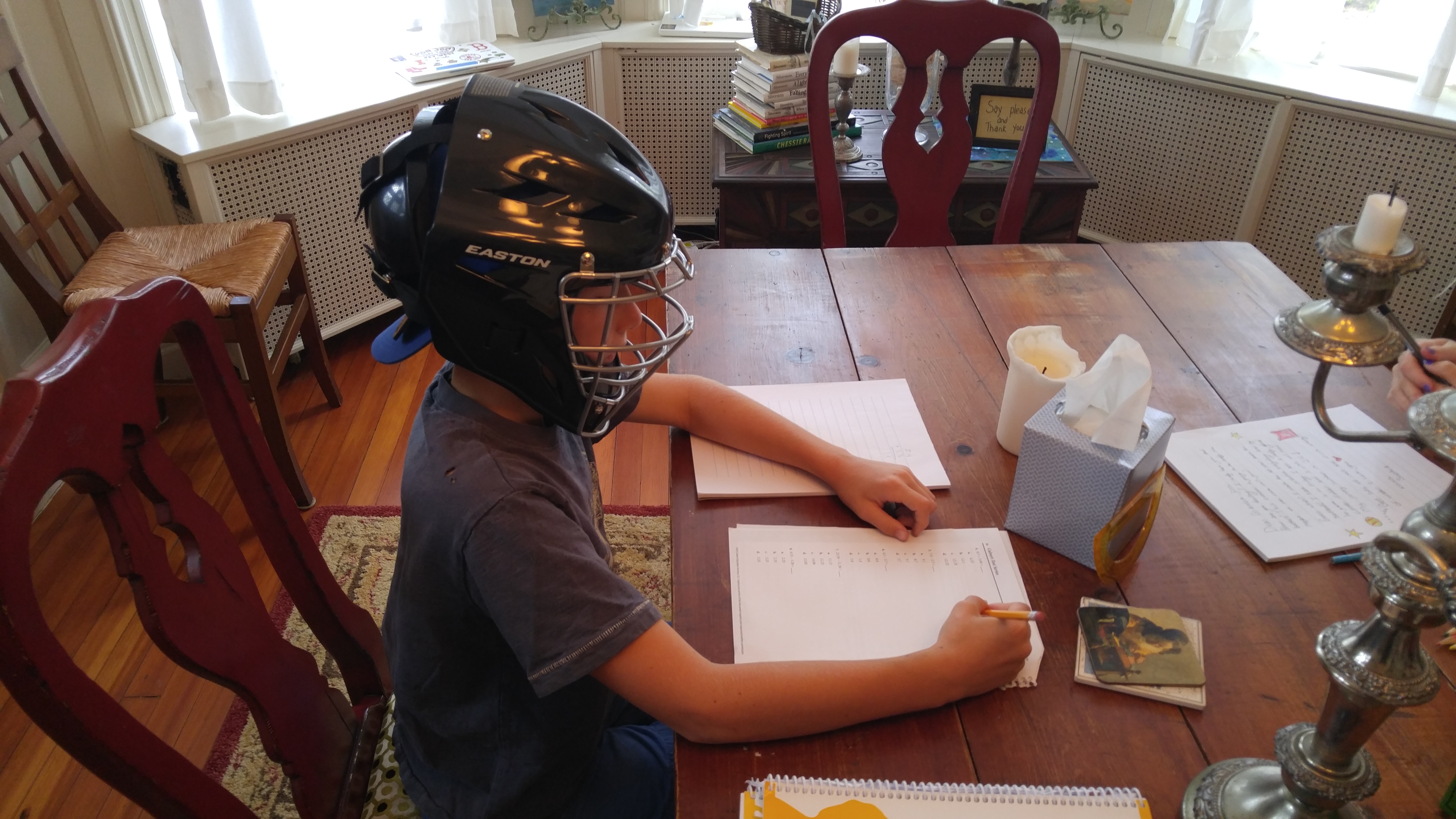Oliver, taking a math test wearing his lucky new catcher’s mask…