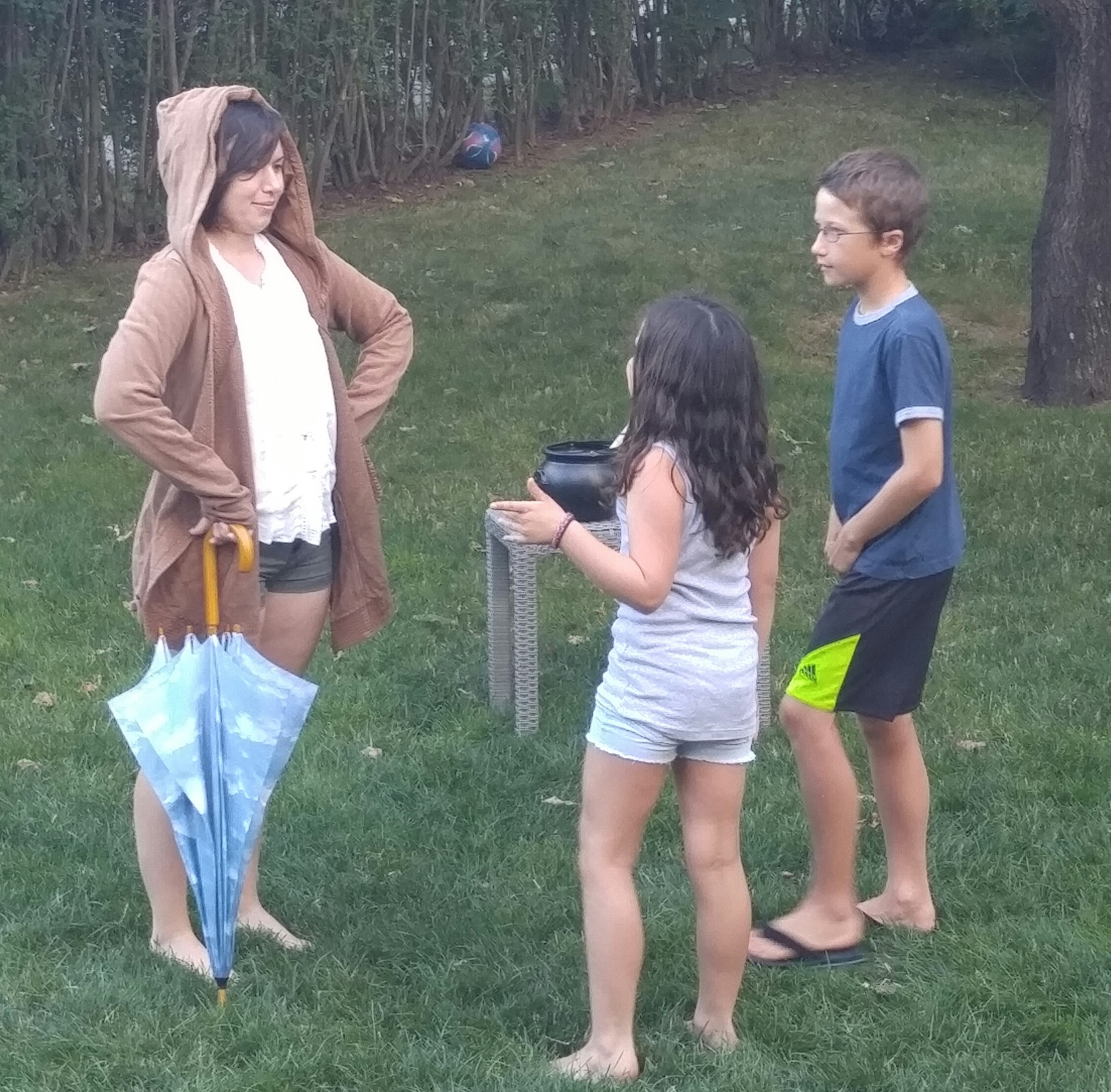 Sydney and Dan were guest stars in a play of “Harry Potter” in the back yard. Also starring Eleanor and Maria Hallisey! (above, see Sydney as “Hagrid” talking to young Harry Potter and Hermione (played by Oliver and Maria).