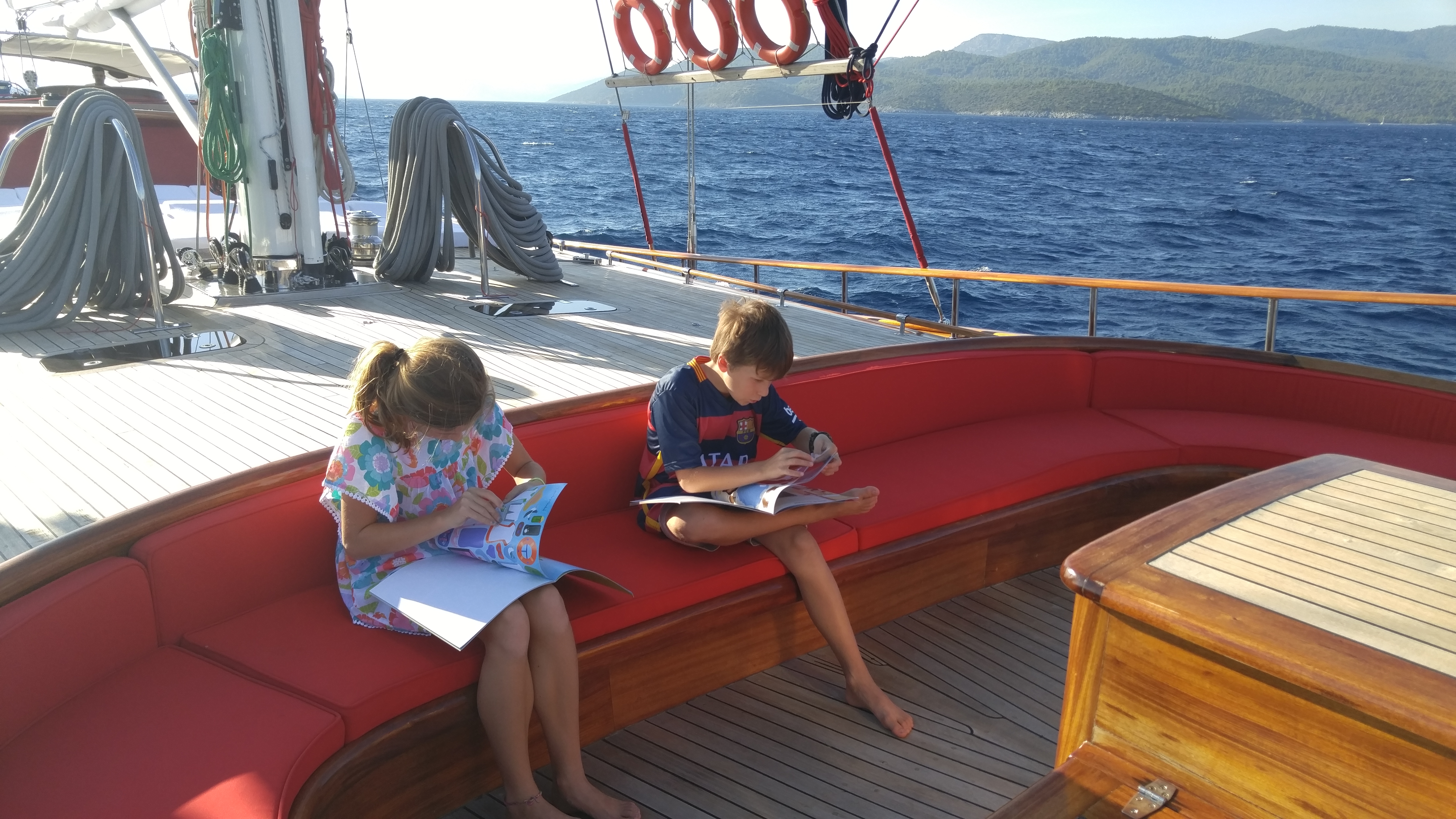 Oliver and Sophia sharing adventure stories with friends Mairen (14) and Sioban (12) who are un-schooled as they travel/live aboard their Stevens 47 (see their family blog at sailingtotem.com). Laura (17), attends a french school in the heart of Valencia, Spain but has spent the last two summers with us in America.