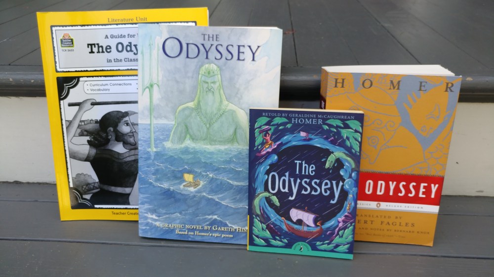 The photo above shows our travel-school’s version of an elementary level “Super Group.” We will use each of these books when reading Homer’s epic poem, The Odyssey. In addition to the original by Homer (the version I chose is translated by Albert Fagles), we will enjoy a graphic novel by Gareth Hinds and an abridged edition by Geraldine M. Caughrean. I will also use a teacher’s resource guide for activities, spelling, vocabulary lists and comprehension tests.