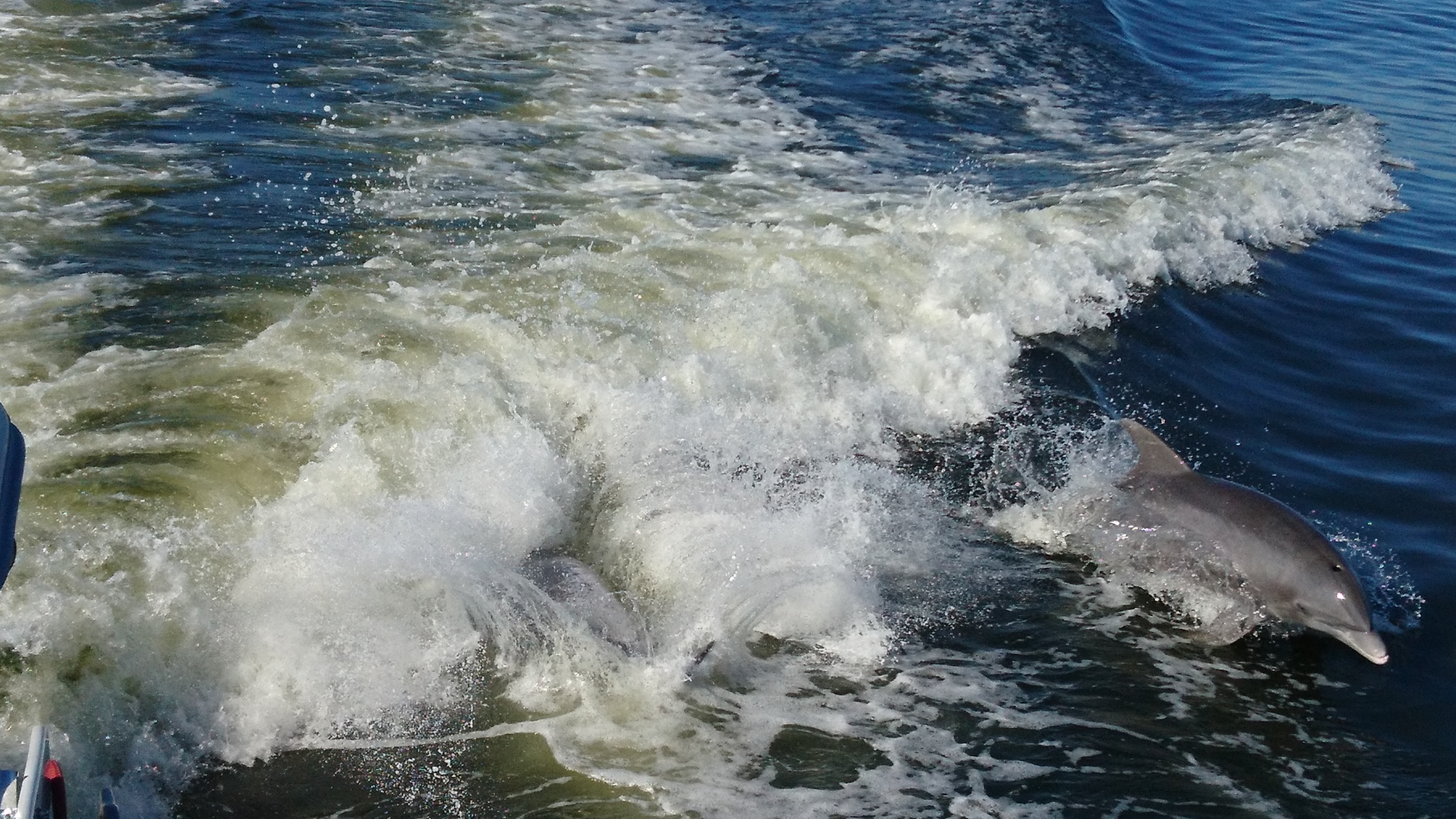 12.20 Dolphins playing in our wake as we cruised south – We consider happy dolphins a good omen.