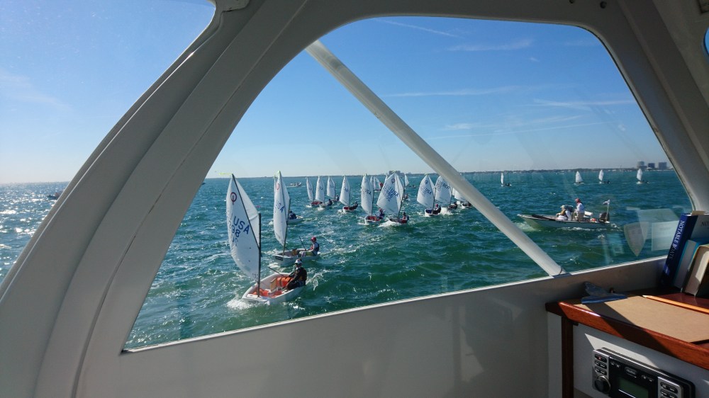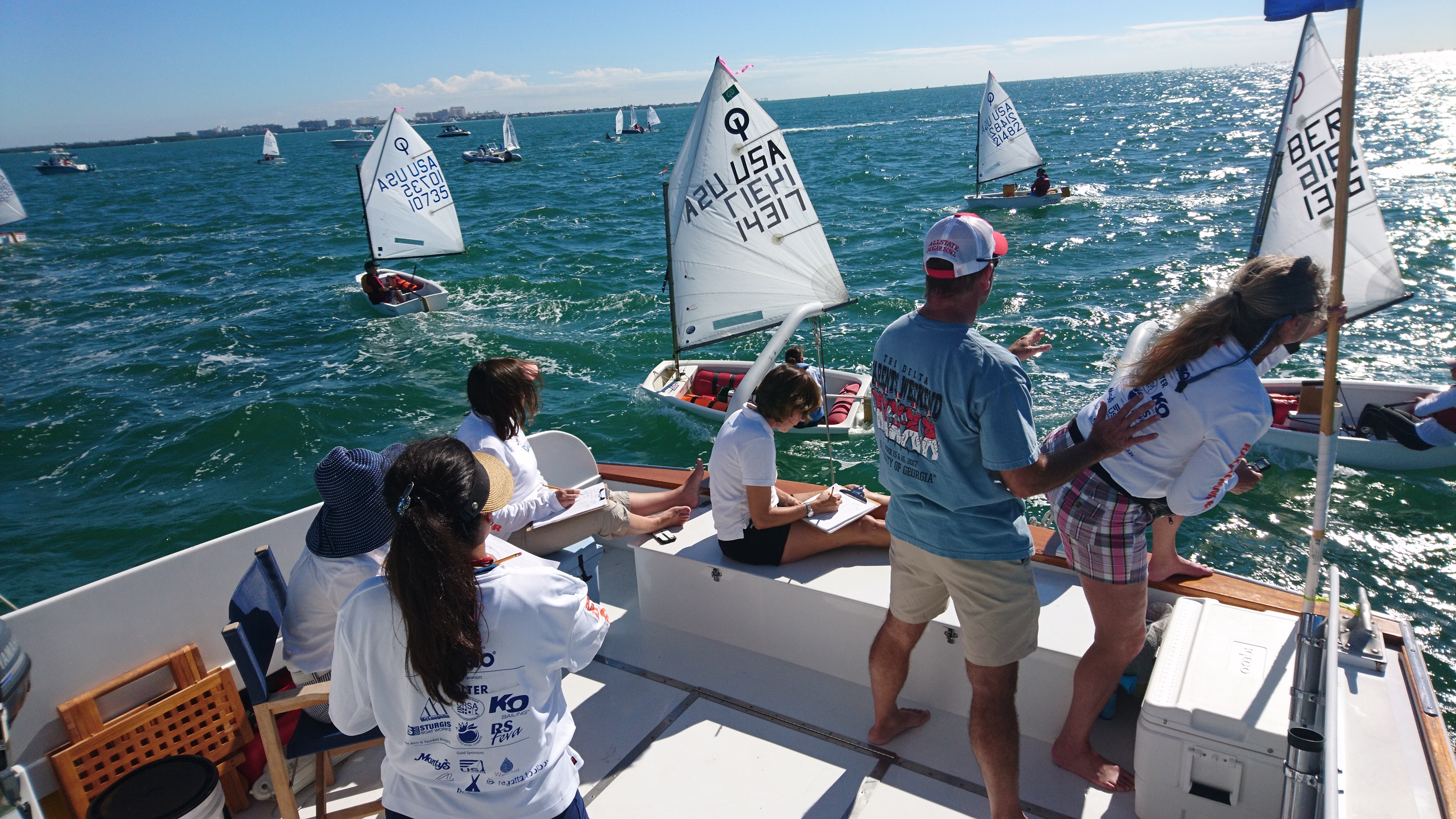 12.27 – 12.30 After Christmas, Timbalero was the finish line boat for the 2017 Orange Bowl International Opti Regatta. For four gorgeous days on Biscayne Bay we hosted a full race committee onboard of dedicated parents and professionals who set up and called the finish of every race. The Coral Reef Yacht Club was home to the Orange Bowl and kids were competing from Malta, Greece, Bermuda, Italy, Mexico, Brazil, NZ, among others… and of course many from the USA. There were over 700 sailors in this junior regatta. We were pleased to help out and Timbalero shined in her role at the finish.