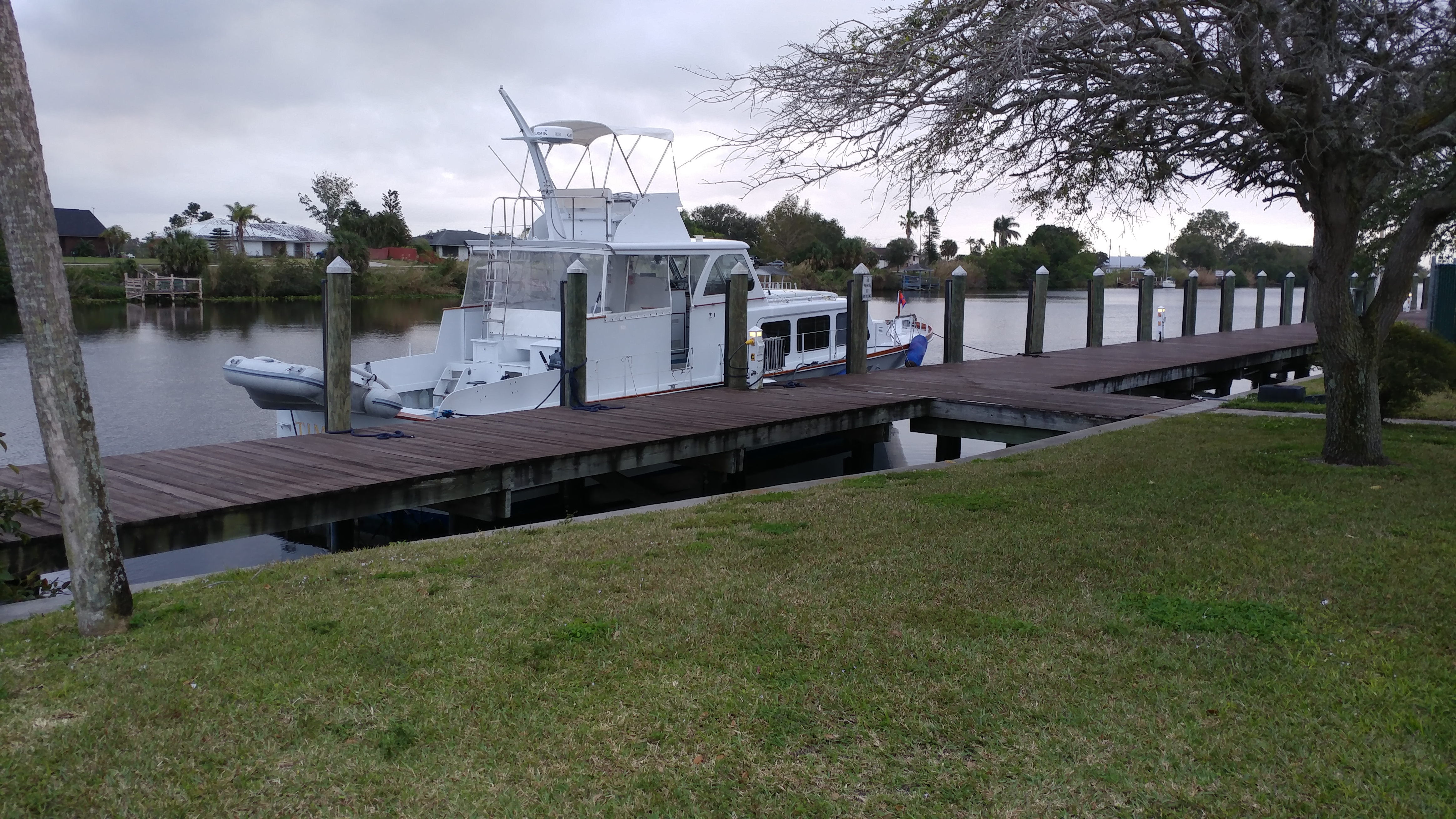 Timbalero, docked at the Moore Haven city dock, half way through the Ft. Myers-Okeechobee locks channel. The dock is a short walk to a public library, thrift store and park.