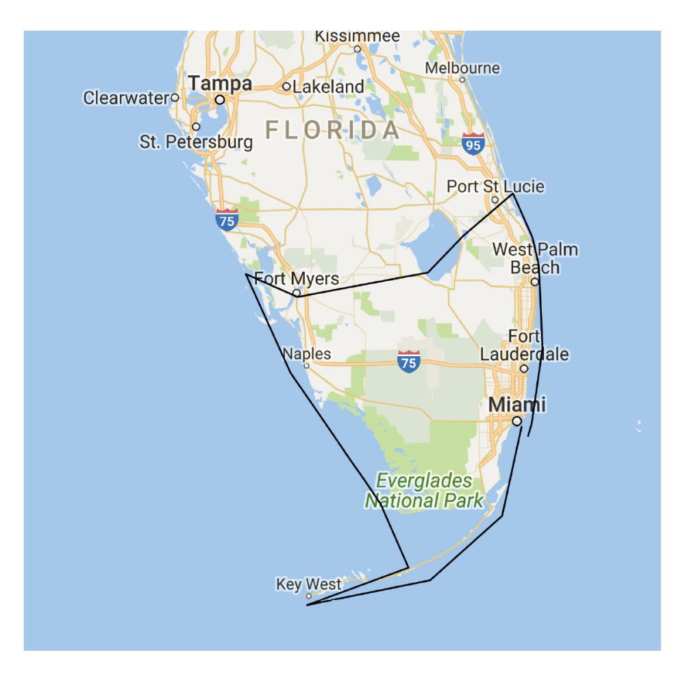 Miami – Key Largo – Marathon – Key West – (back to) Marathon – Cape Sable – Naples – North Captiva – Ft. Myers – Moore Haven – Stuart – Jupiter – Boca Raton – Ft. Lauderdale – Miami