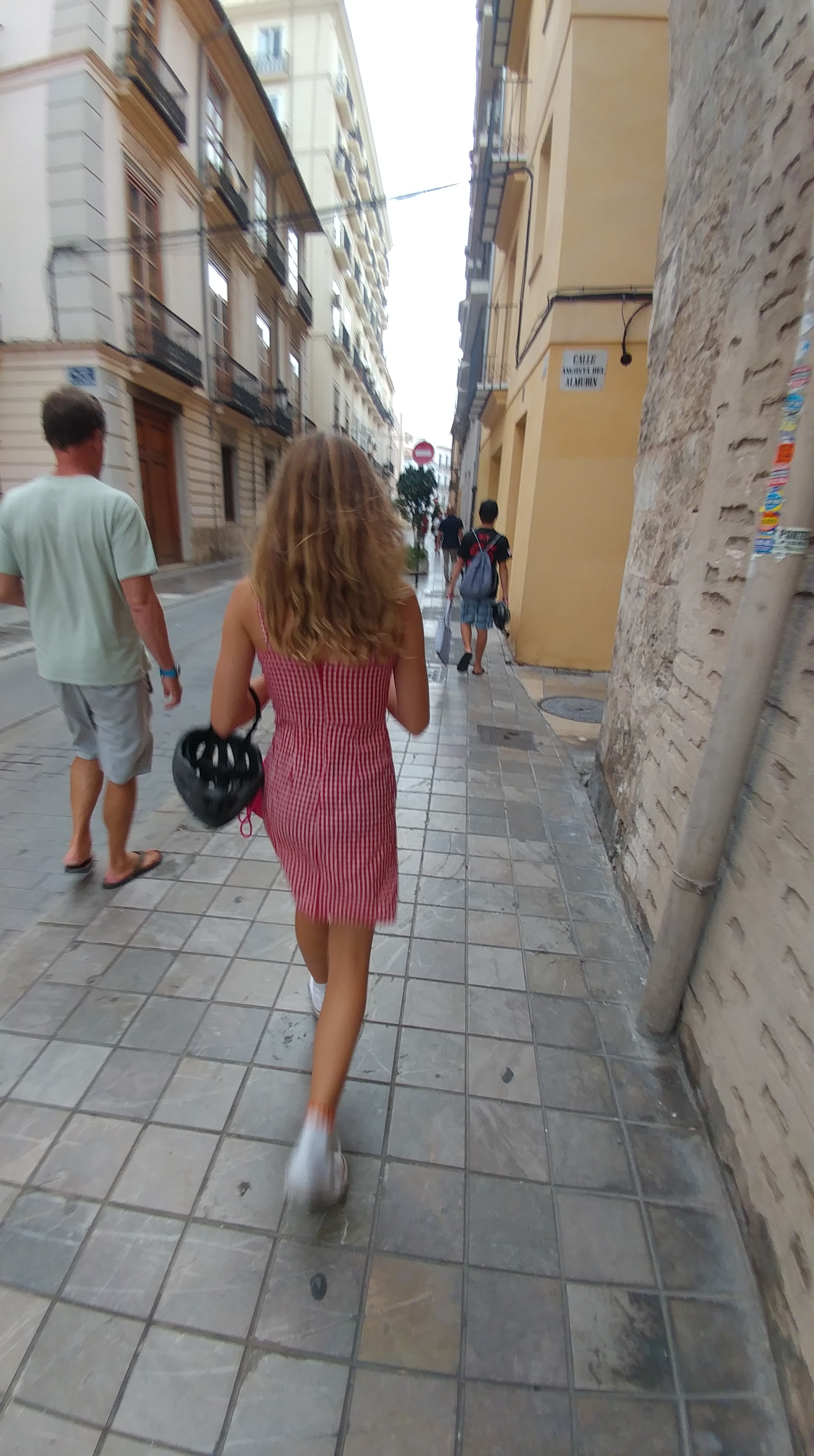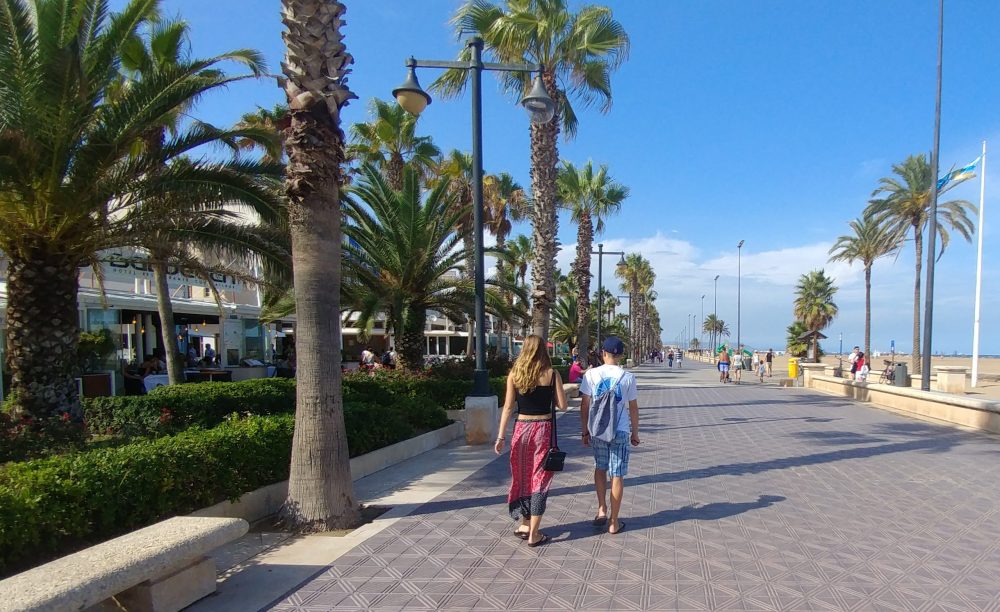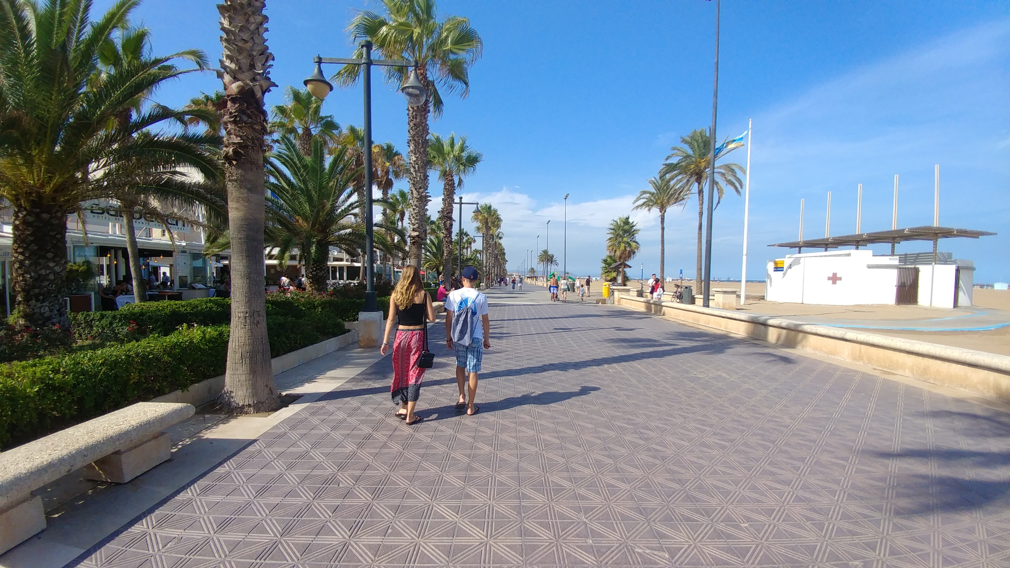 Time to go! Sophia and Oliver walking the promenade at Las Arenas beach, Valencia.