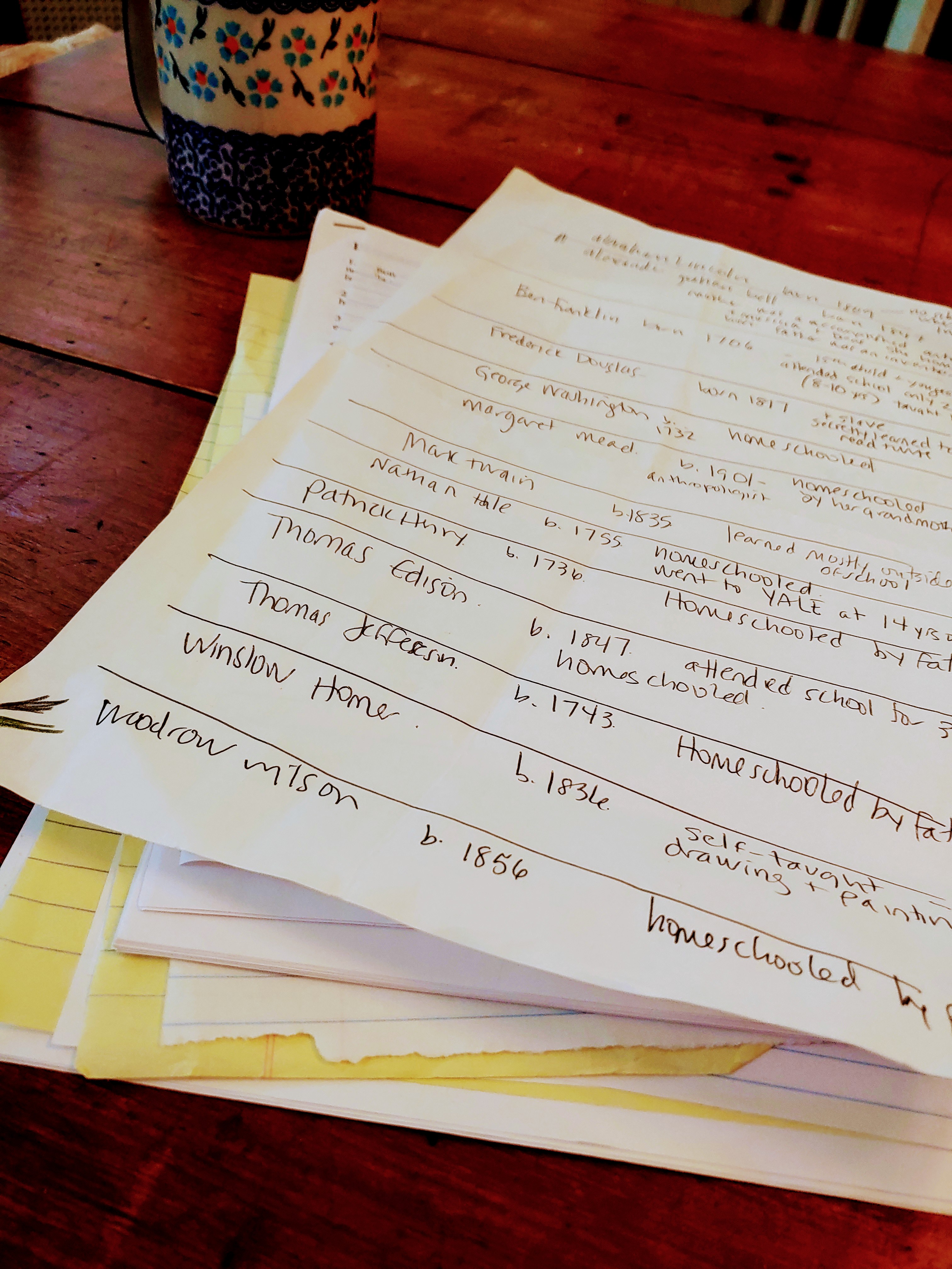 I placed my curriculum orders online, waited and prayed I chose well. When the books and materials arrived, I was both giddy to start and full of anxiety. Waiting out the summer until September, was a nervous time for me. So I compiled a home-grown list of “Homeschool Heroes” which was critical to my positive glow. These awesome people turned out OK? Although they are old-timers, I found strength in their names and stories. Hand-written and crumple-edged, I have kept it on my desk ever since. Anytime I feel over-whelmed or anxious about the kids, or our school being “good enough”, I pull out my aged list for strength and support. It works every time.