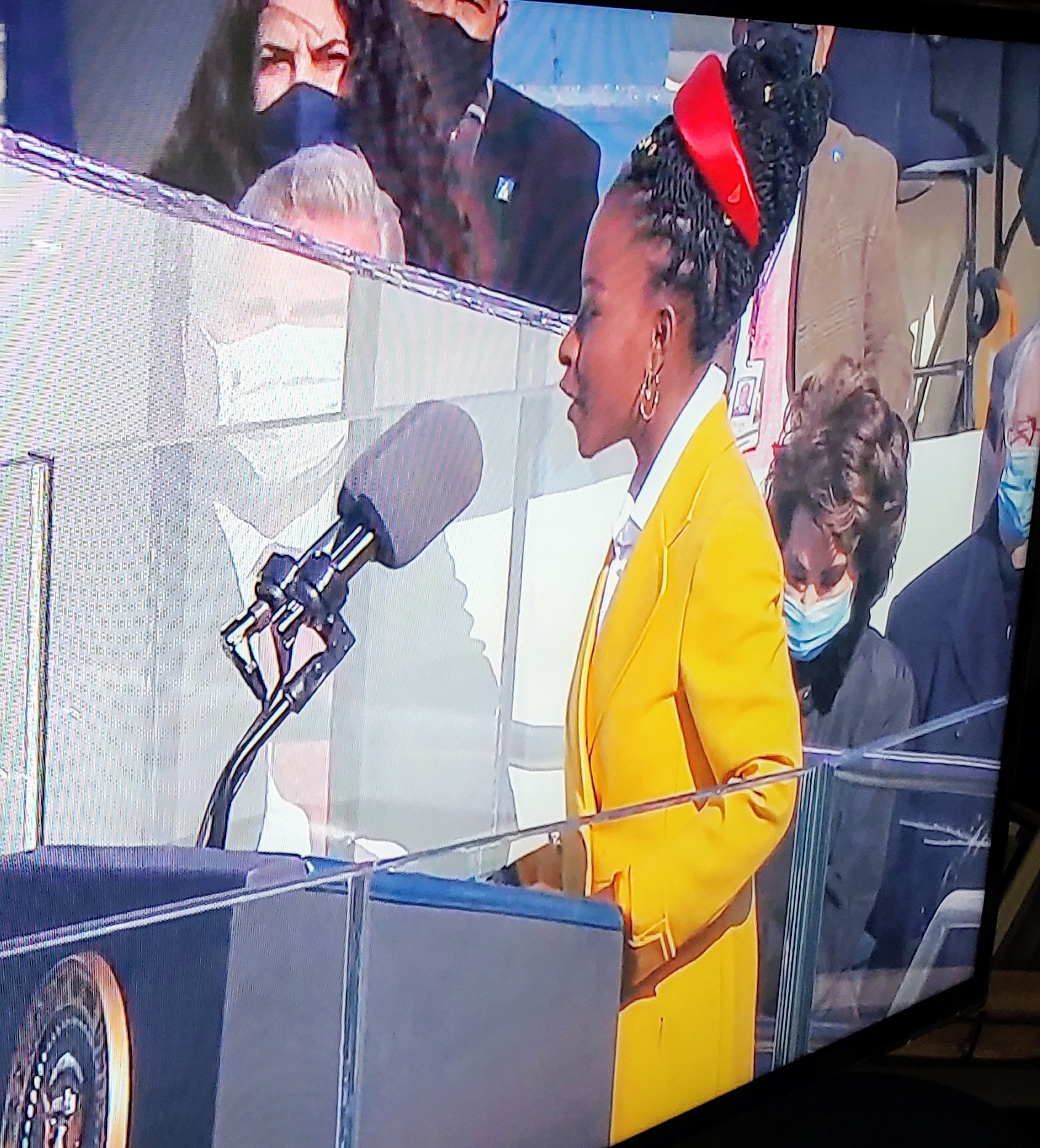 Amanda Gorman is only twenty-two years old. She is the youngest poet to read for a presidential inauguration and was an inspiration to us. Her work was powerful and passionate, like others we had seen in the “Louder Than a Bomb” spoken-word poetry slam in Chicago. Her poem, titled, “The Hill We Climb” was written within the past two weeks, after the insurrection riots at the U.S. Capitol in early January and she did not soft-pedal those events. She performed her poem with grace and artful precision and delivered a work that will be remembered by many.