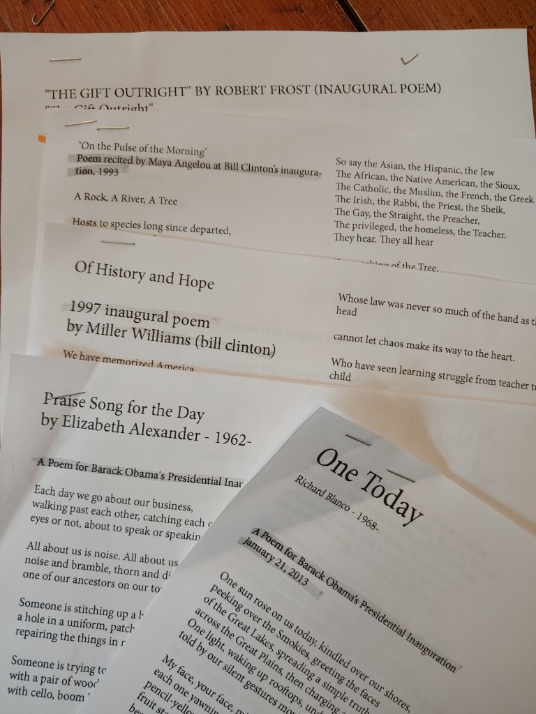 January 20, 2021: We began this slightly snowy winter morning by studying poetry from past inaugurations. The history of Inaugural Poets is short (only five poems have been included in any of our nation’s past U.S. Presidential Inaugurations) and specific to only three U.S. Presidents: John F. Kennedy (1961), Bill Clinton (1993 and 1997), and Barack Obama (2009 and 2013). These three presidents left behind a legacy of caring for the arts and each was known to have had a high level of appreciation for reading and literature.