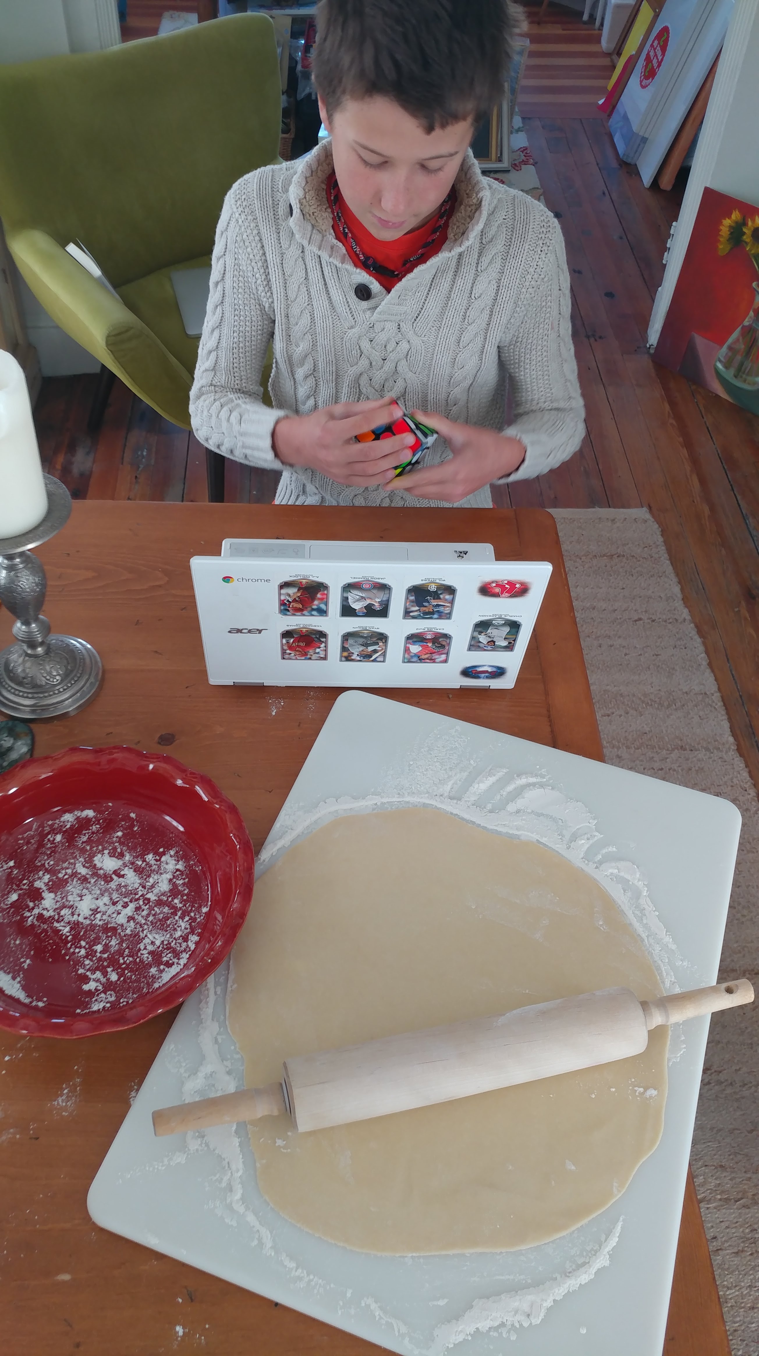 Oliver pursuing his latest passion, the cube, while I bake our “Pi Day” apple-pear crumb pie.